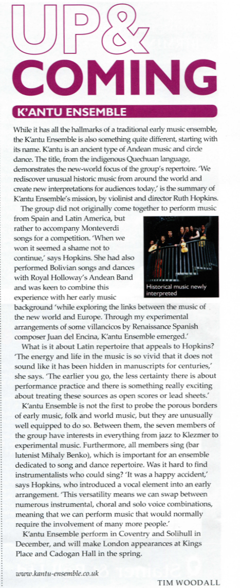 "K'antu Ensemble is a breath of fresh air: early music presented with beguiling virtuosity and inventiveness.” (Howard Skempton, Composer)