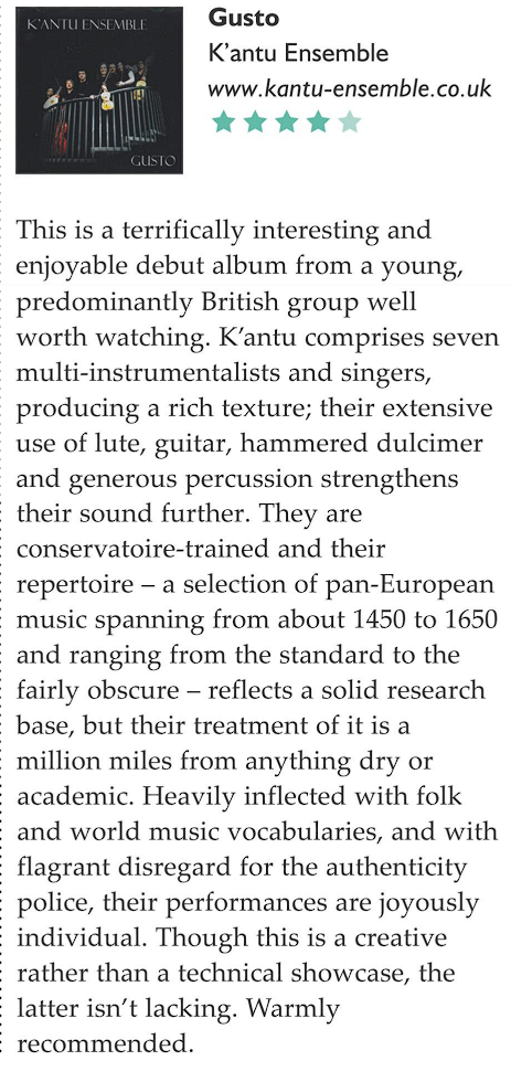 "My expectations of super repertoire and skilled musicianship on an array of instruments were amply fulfilled - but I had not anticipated that two standout voices would be so ably supported by the others to create a rich, vocal sound, nor the sheer joie de vie of these musicians, revelling in their music making. Kantu's concert was musically enchanting, fresh and fun - and an absolute delight. Highly recommended." (Jill Tomalin, Totnes Early Music Society)